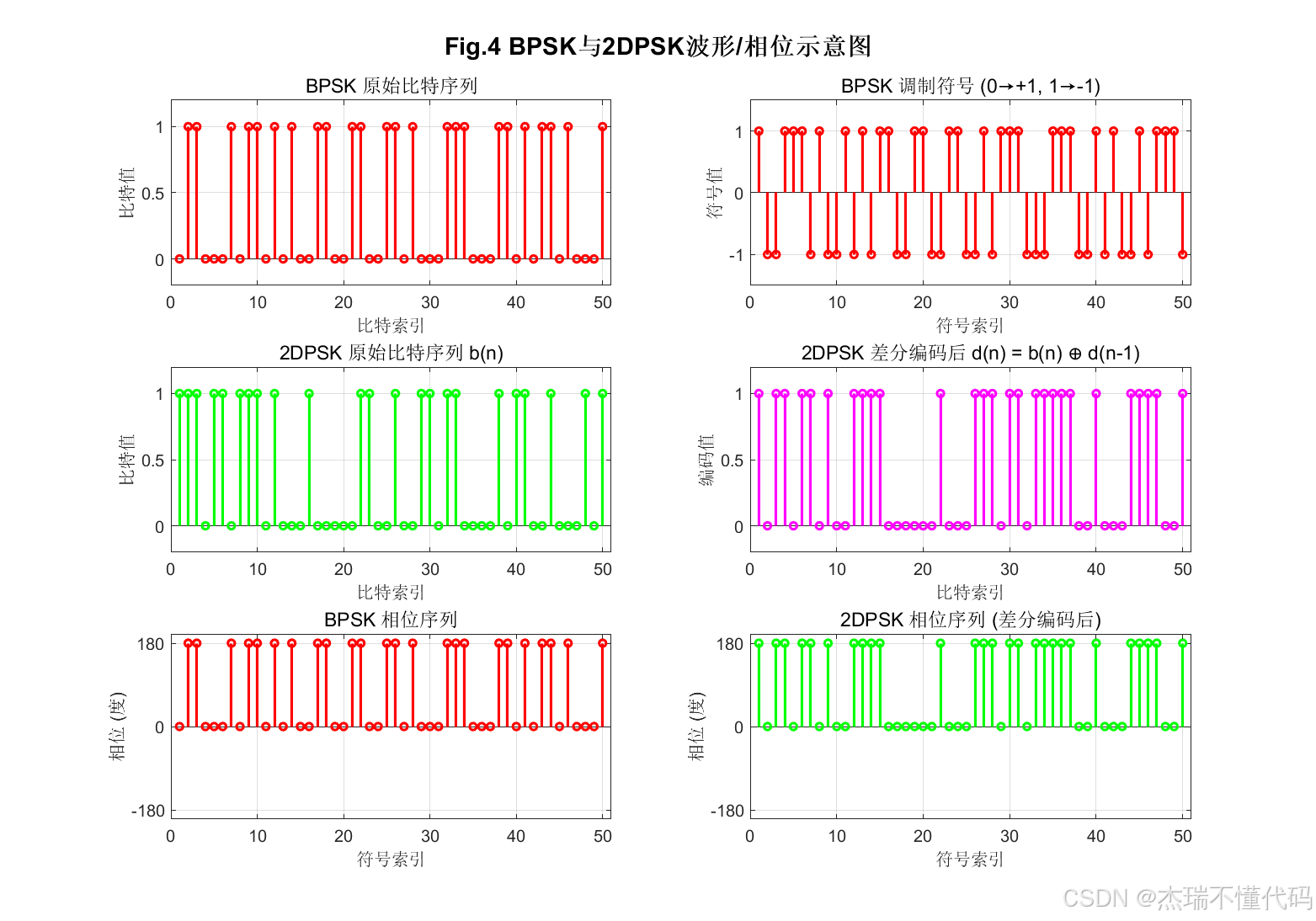 bits_dpsk_rx = [bits_dpsk(1), real(diff_detect) < 0]; % 第一个比特无法恢复,用原始值