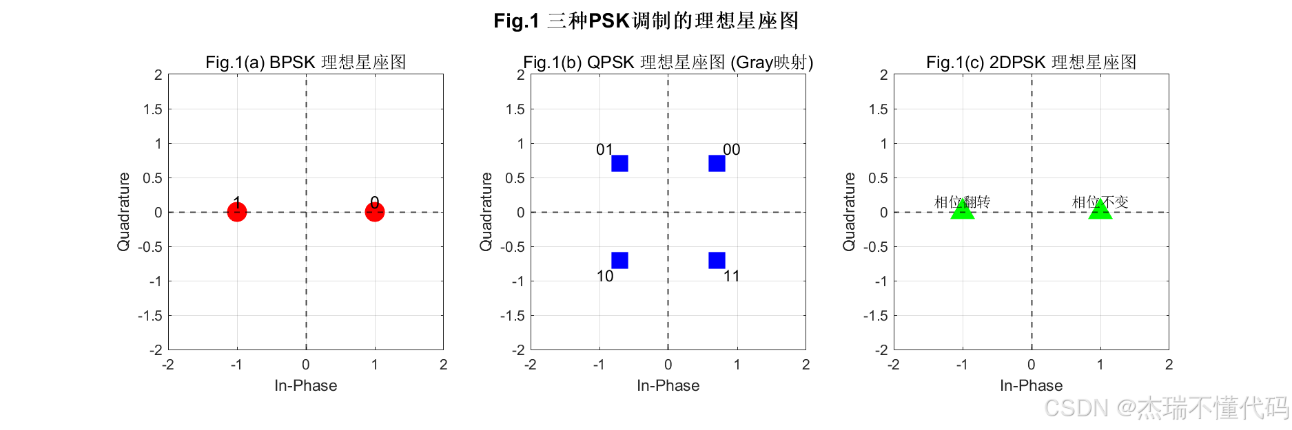 调制参数方面,BPSK 与 2DPSK 均属于二进制相位集合( M = 2 M=2 M=2),每符号 1 bit( k = 1 k=1 k=1);QPSK 取 M = 4 M=4 M=4,每符号 2 bit( k = 2 k=2 k=2),并采用 Gray 映射以降低相邻符号误判导致的比特错误扩散。在能量归一化层面,QPSK 星座点通过单位平均能量处理,使 E ∣ s ∣ 2 = 1 \mathbb{E}{|s|^2}=1 E∣s∣2=1,从而与噪声方差公式中的 k k k 一致匹配;BPSK/2DPSK 映射值为 ± 1 \pm 1 ±1,同样满足单位能量条件。这一细节直接决定了"仿真曲线与理论曲线能否在同一坐标系下重合",也是 PSK 性能对比类仿真中最容易出现偏差的环节。