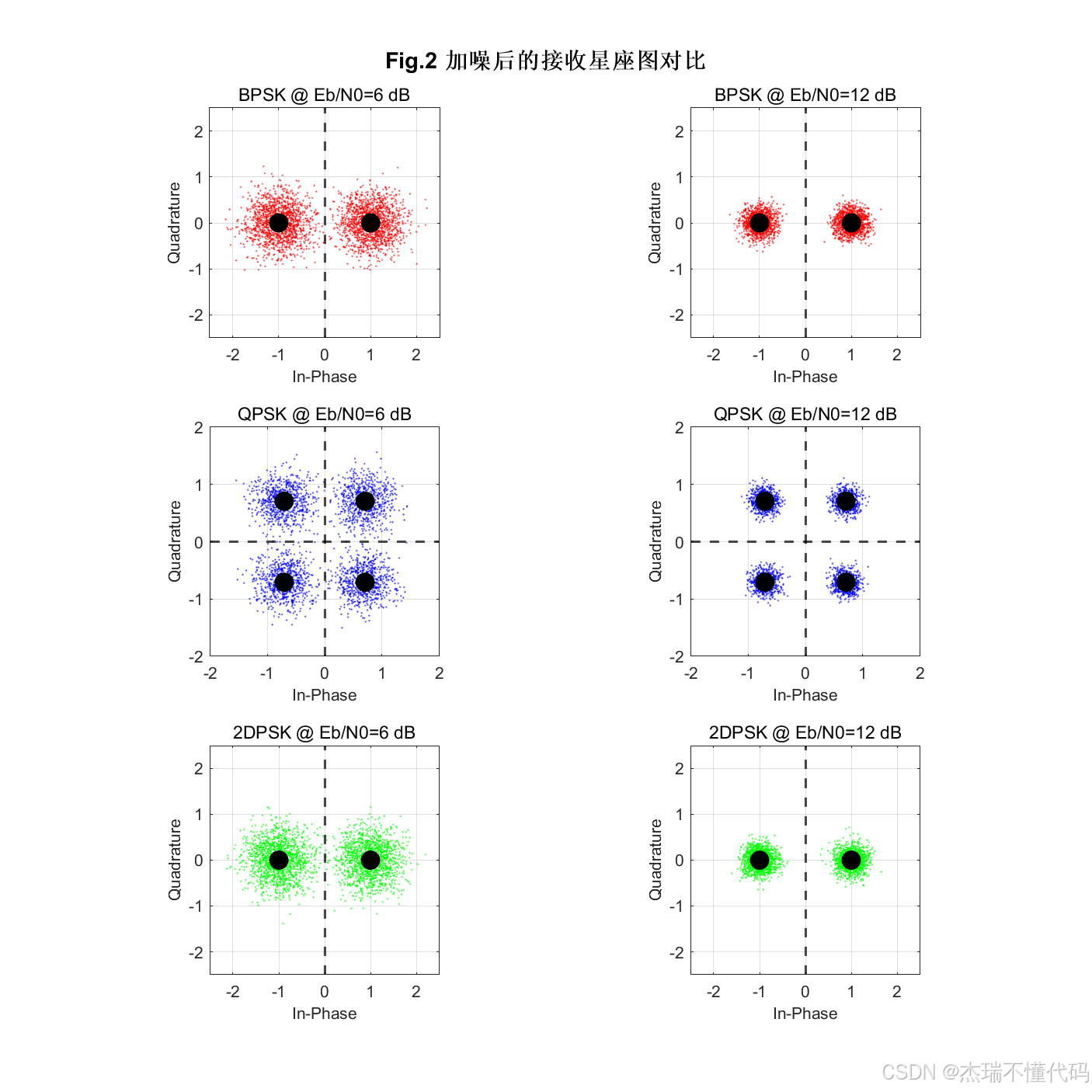 接收端判决方面,BPSK 与 QPSK使用相干检测:BPSK 通过实轴零阈值判决恢复比特;QPSK 则根据接收符号相位所在象限完成符号判决,并通过 Gray 反映射恢复比特序列。对于 2DPSK,程序使用典型差分检测结构,利用相邻接收符号的共轭乘积构造判决量