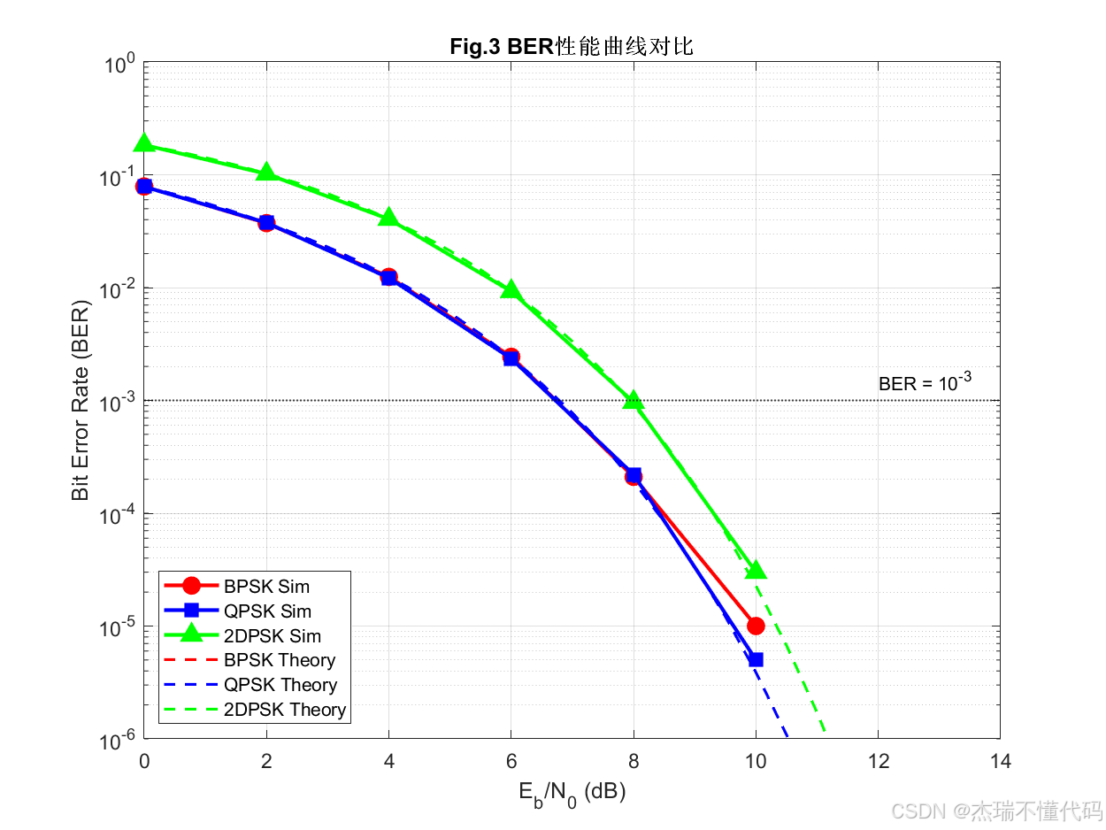 从而在同一 BER-- E b / N 0 E_b/N_0 Eb/N0 曲线中体现"差分系统相对相干系统存在固定的性能损失"的规律。