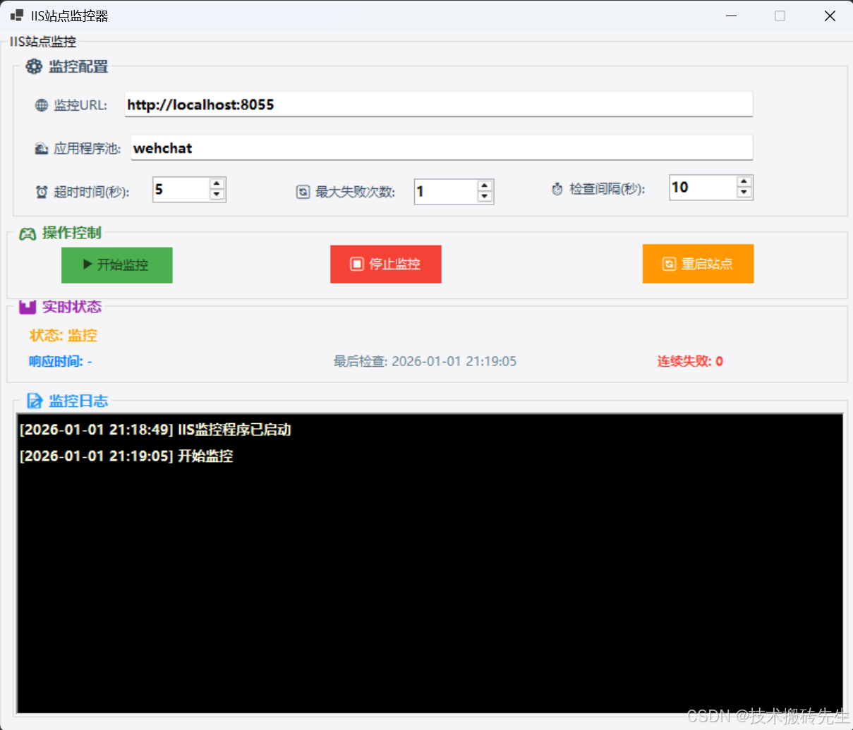 - 操作控制区:开始/停止监控、手动重启IIS