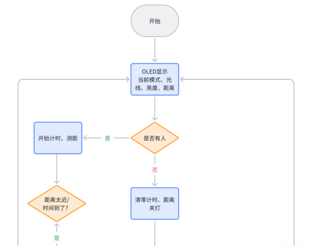 - 智能模式下,根据光照强度自动调整光照档位(低亮、中亮、高亮),没人则自动光灯;