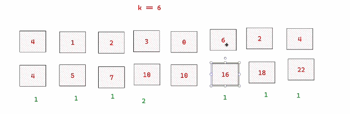 比如遍历到s[j]=16这个情况,16-k=10,发现前面的cnt[10]有两个,那就直接说明有两解