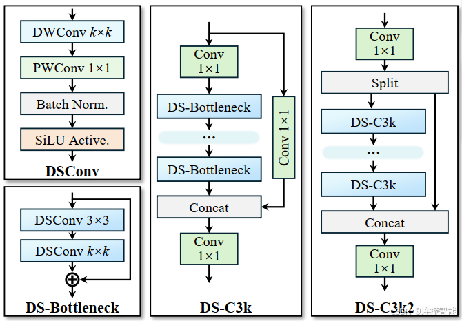 实现代码与原有的C3k2模块基本一致,只是将原始Bottleneck类中的Conv替换为了DSBottleneck类中的DSConv。