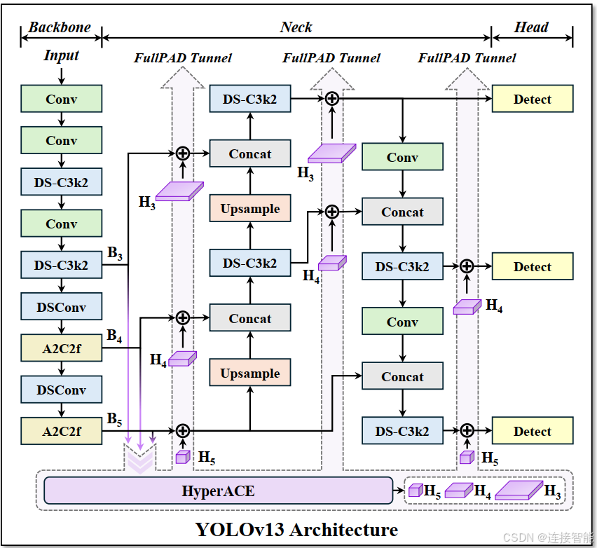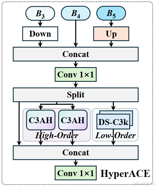 - FullPAD范式将B3、B4和B5输入到HyperACE模块产生增强的H4,分别对H4上、下采样得到H3与H5;