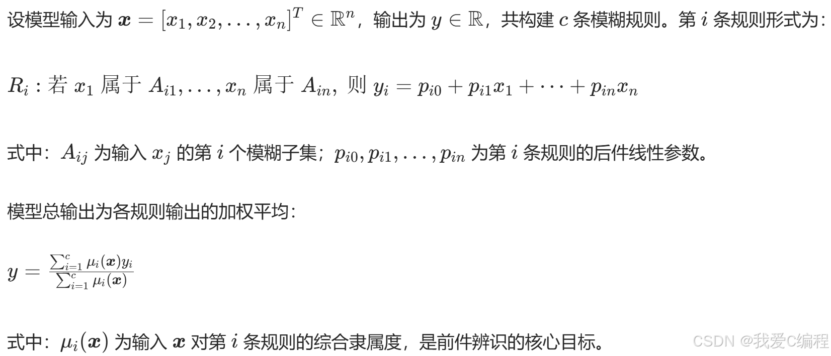 **后件参数辨识:**采用LS(最小二乘)法,将模糊规则的后件线性输出转化为线性方程组,通过最小化模型输出与实际输出的误差平方和,求解后件的线性系数参数,保证模型的拟合精度。 该方法结合了FCM聚类的模糊划分能力与LS法的线性最优估计特性,在非线性系统建模中兼具柔性与精度。
