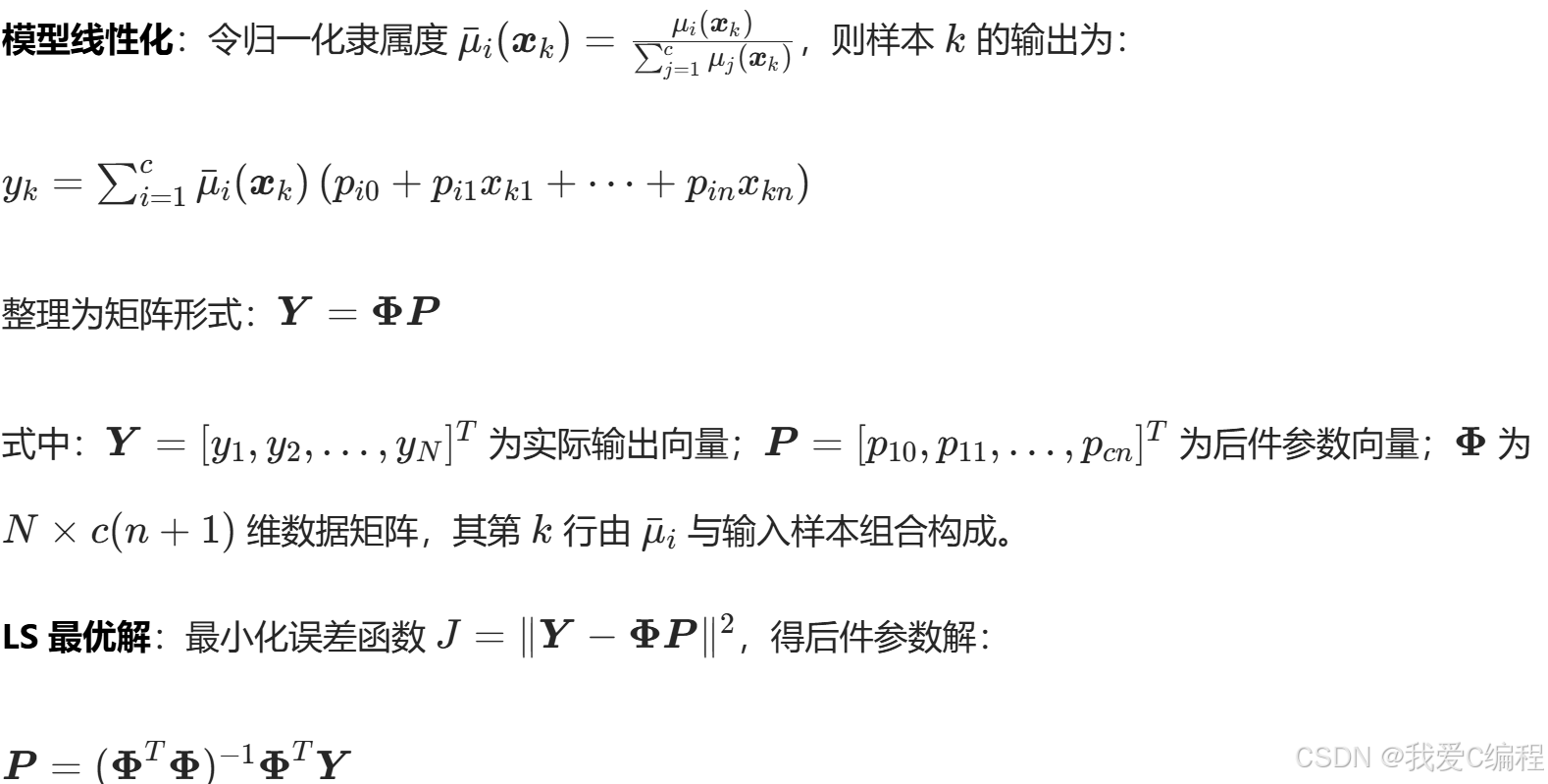将模型输出转化为线性形式,通过LS法最小化输出误差,求解后件参数P。