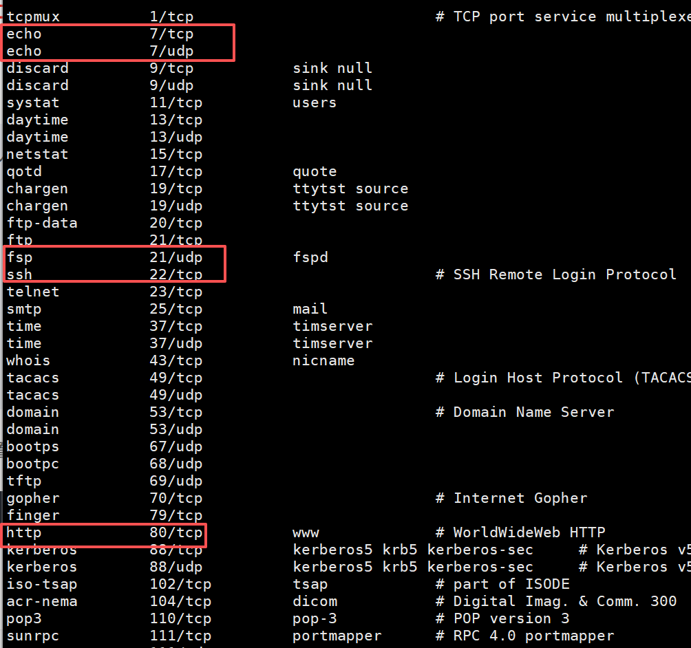 我们可以在Linux下输入cat /etc/services来查看这些知名端口号: