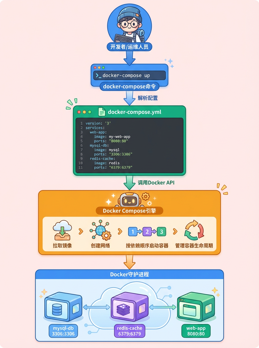 核心特点:通过配置文件(YAML)管理容器,简化多容器部署