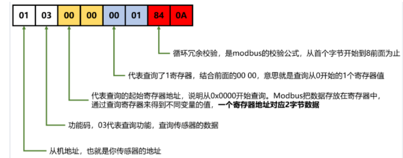 03 - 功功能码,03代表查询功能,查询传感器的数据。这⾥要注意的是注意发给从机的功能码是啥,从机就要回复同样的功能码,如果不⼀样说明这⼀帧数据有错误