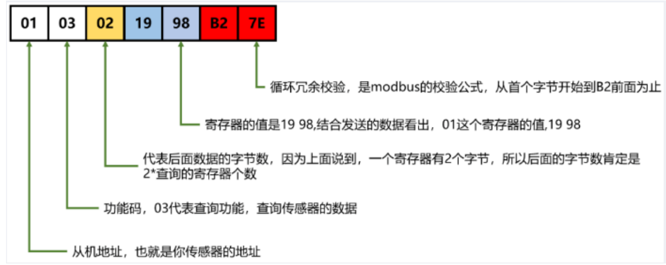 回复:从机的地址+主机发我的功能码+要发送给主机数据的字节数+数据+校验码。