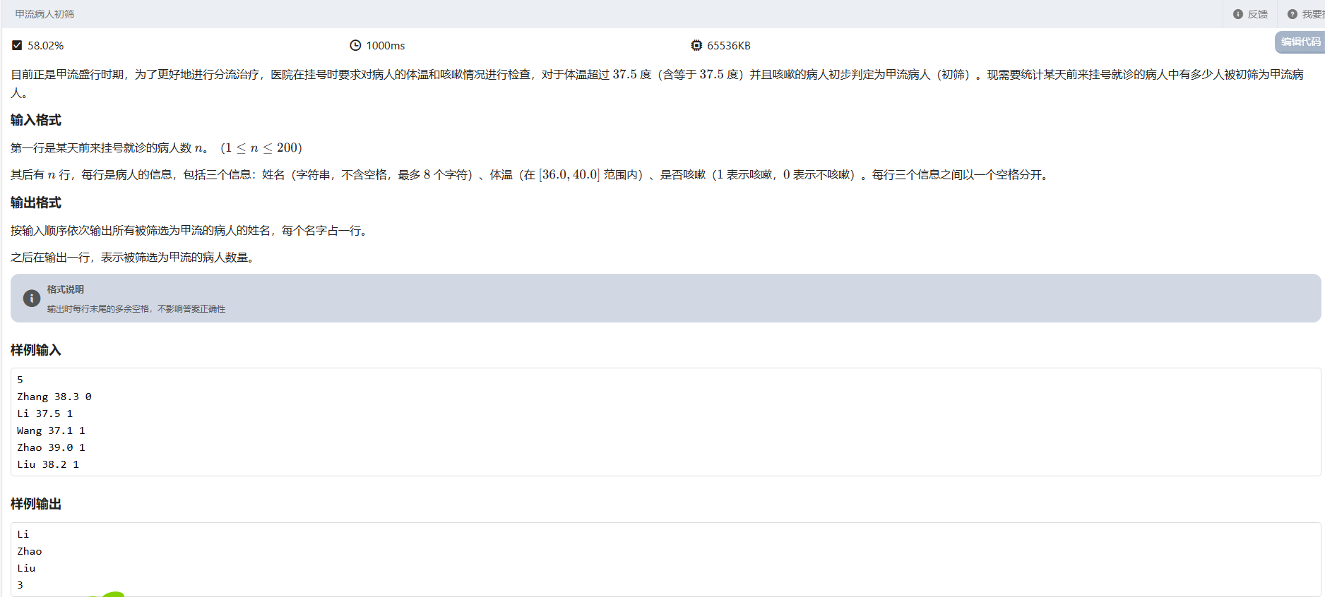 if(Tp >= 37.5 && cough){cout << name << endl;sick++;}//如果符合条件,输出名字,病人数量加一