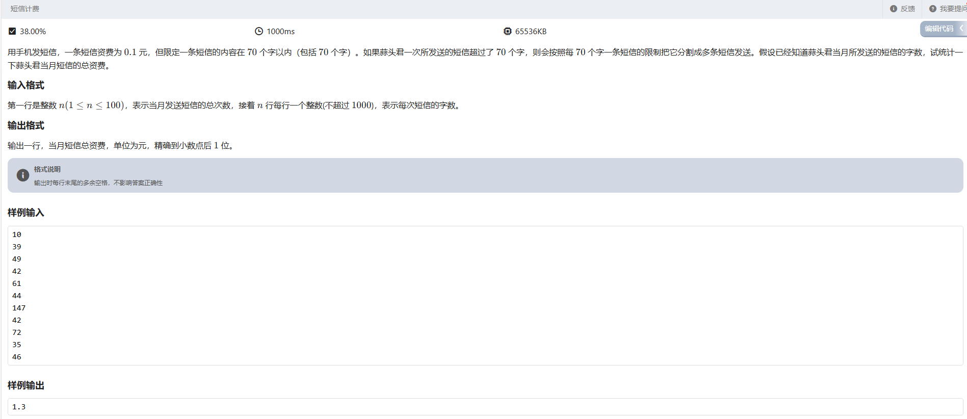 if(code%70 > 0) cost += 0.1;//多余不足70个字的按一条算