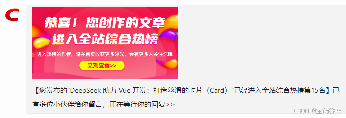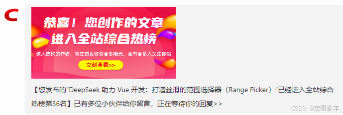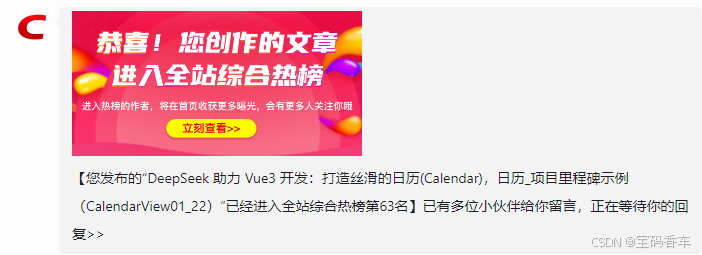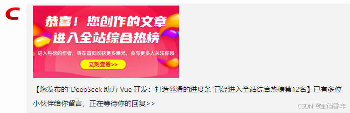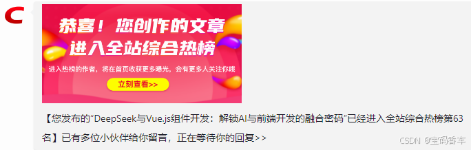 该系列推出后,获得了Vue3开发者群体的广泛关注与认可,多篇文章累计阅读量突破25万,其中多篇入选CSDN前端领域热榜,多篇被Vue3中文社区、前端开发博客等平台转载。有读者反馈:"跟着这个系列用DeepSeek开发Vue3项目,开发效率提升了60%,以前需要半天搞定的组件封装,现在1小时就能完成,还能保证代码质量";还有企业级开发者留言表示,系列中"AI代码优化技巧"帮助团队解决了大量AI生成代码的适配问题,降低了团队的沟通成本与调试成本。这个系列的成功,不仅让我更坚定了"聚焦细分场景、解决实际痛点"的创作方向,也为后续开展多语言系列创作积累了宝贵的实战经验。