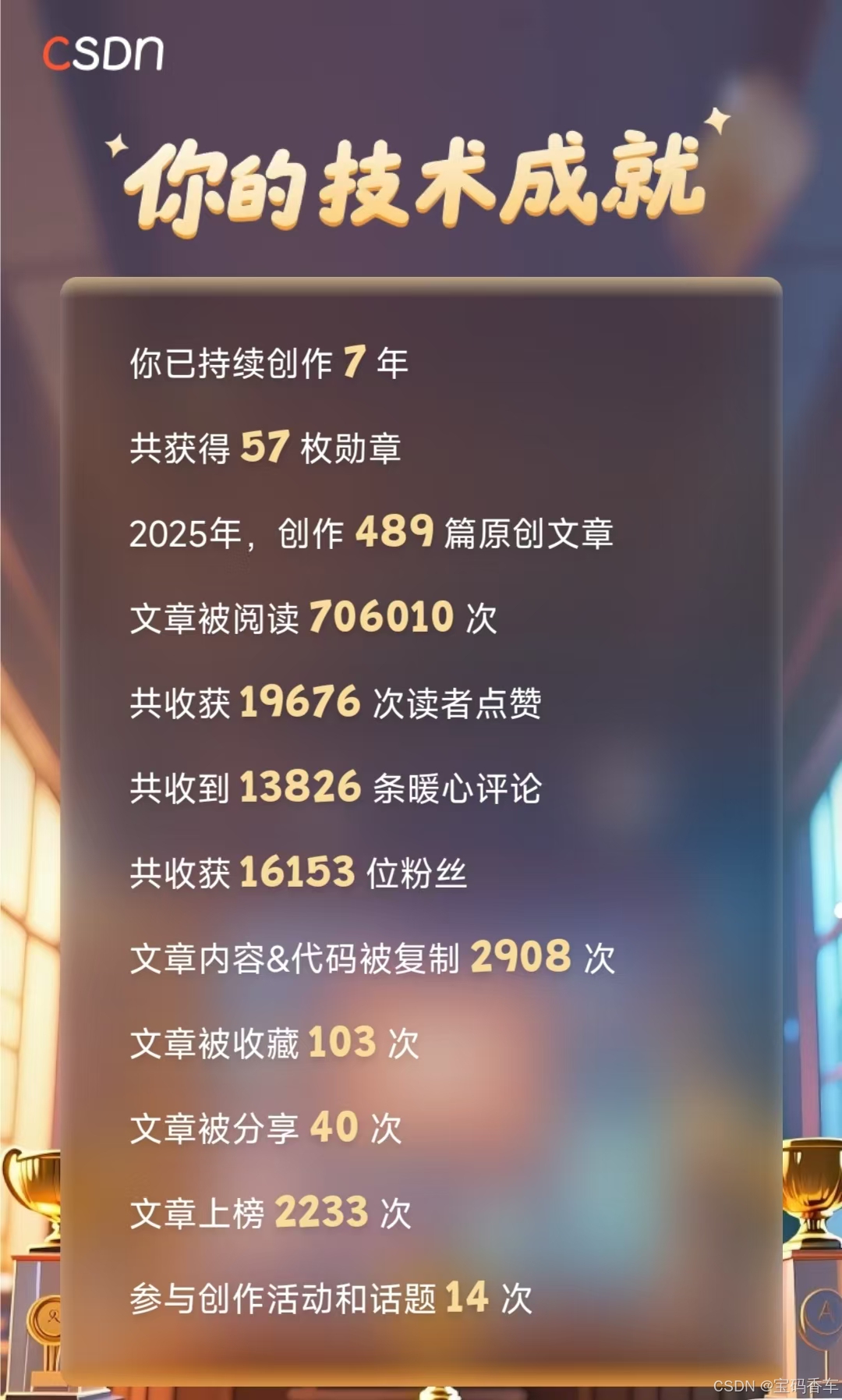 时光像一行行迭代的代码,不知不觉间就跑完了 2025 全年的旅程。站在岁末的节点回望,这一年于我而言,是深耕技术创作的"攻坚年",是实现个人能力跃迁的"成长年",更是探索生活与事业平衡之道的"修行年"。作为CSDN平台上一名聚焦AI时代开发者成长的创作者,"宝码香车"这个ID背后,承载的是我对技术的敬畏、对分享的热忱,以及对"让复杂技术变易懂"这一初心的坚守。