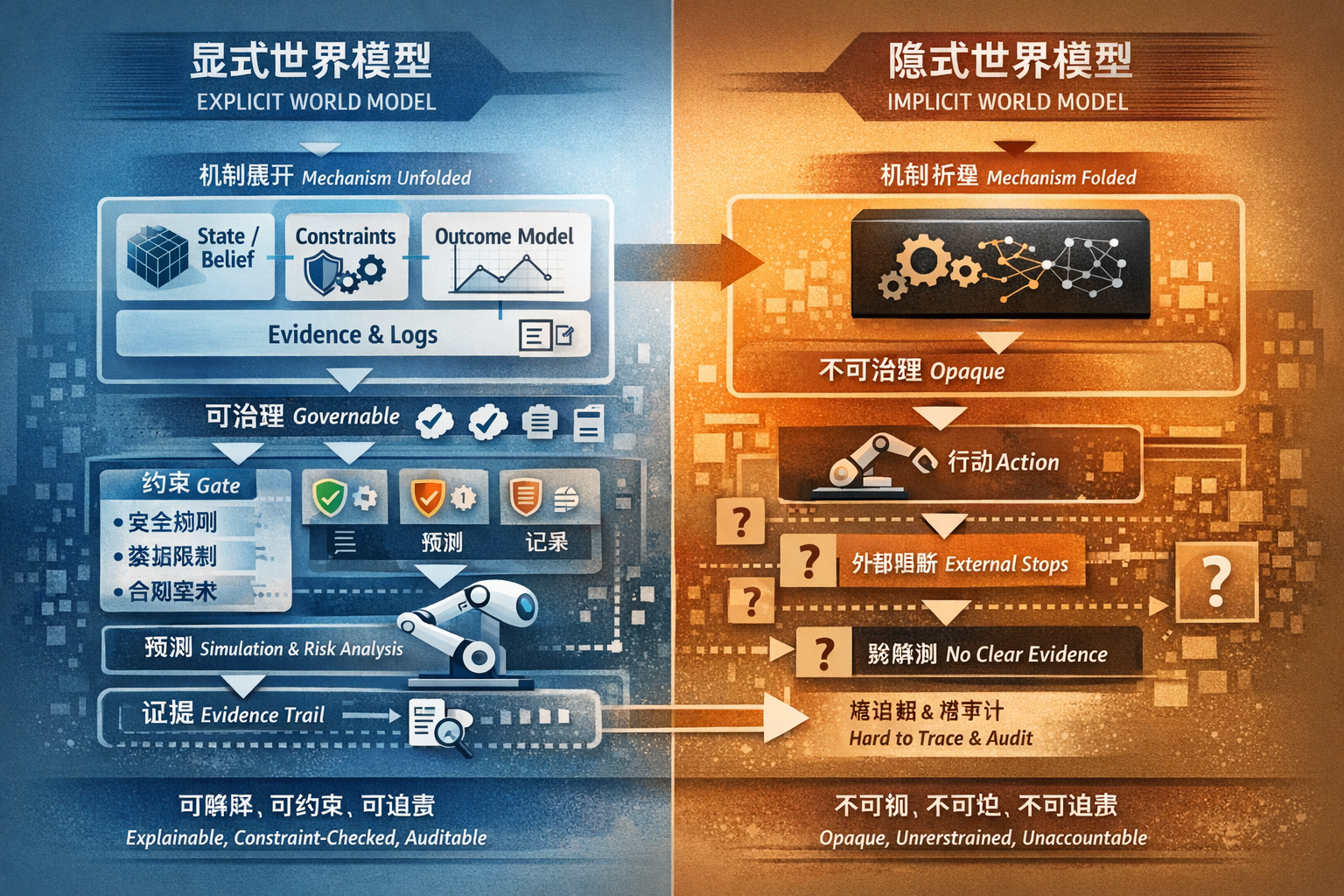 因此更准确的问题是:**世界模型是隐式地"折叠"在参数与策略里,还是显式地"展开"为可操作、可验证、可治理的结构?**这便是隐式世界模型与显式世界模型的分野。