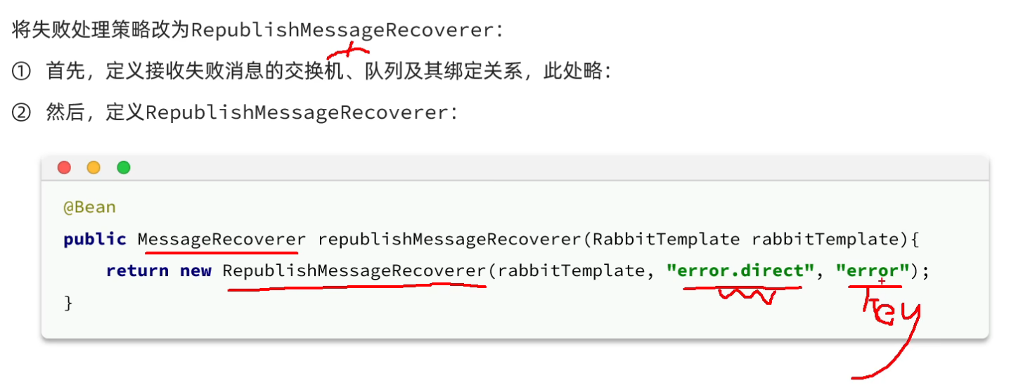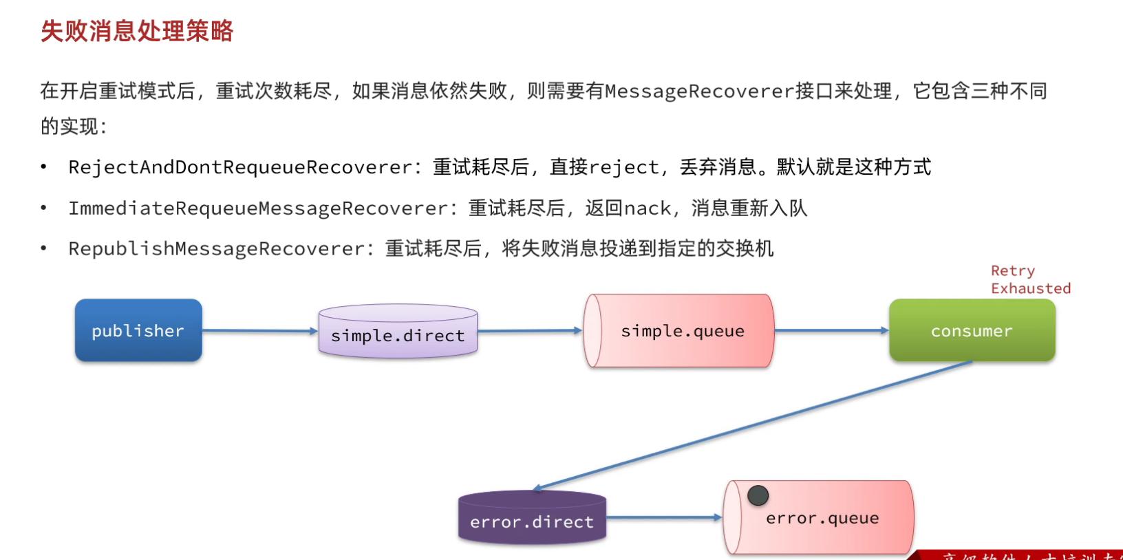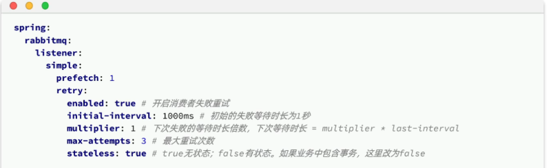 我们可以利用 Spring 的 retry 机制,在消费者出现异常时利用本地重试 ,而不是无限制的 requeue 到 mq 队列,如果本地重试次数耗尽还是失败,我们需要采用失败消息处理策略
