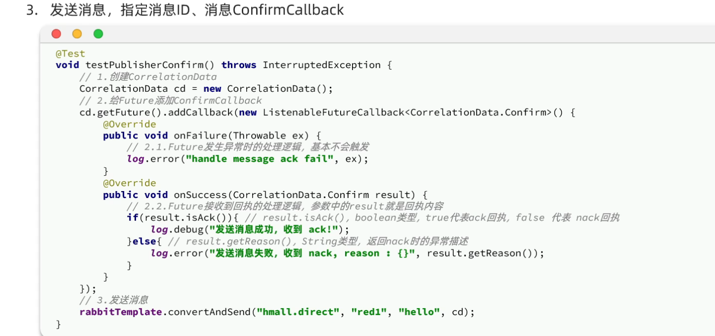 3.(队列是持久化队列)当消息发送到了MQ的交换机,且到达队列,且完成持久化,PublisherConfirm会返回ACK,通知消息发送成功
