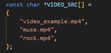 - 将 VIDEO_SRC 数组下的文件名称改为SD卡下的存放的mp4文件名称,mp4文件存放在SD卡的根目录下。