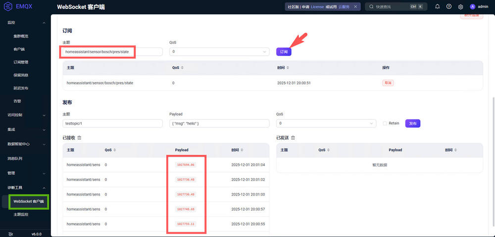 homeassistant/sensor/bosch/temp/state,点击订阅按钮; - 在已接收版块可看到传感器数据,两秒更新一次;