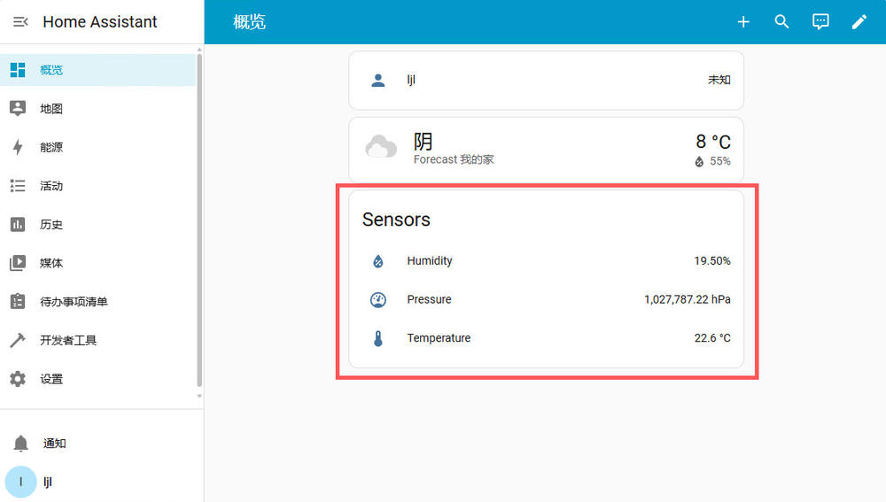 进入 概览 页面,刷新网页,可获得实时传感器数据