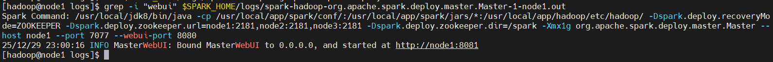 Master 端口分「通信端口(7077)」和「Web UI 端口(默认 8080)」,可以通过日志查看启动的端口,日志路径格式:spark-<用户名>-org.apache.spark.deploy.master.Master-1-<节点名>.out