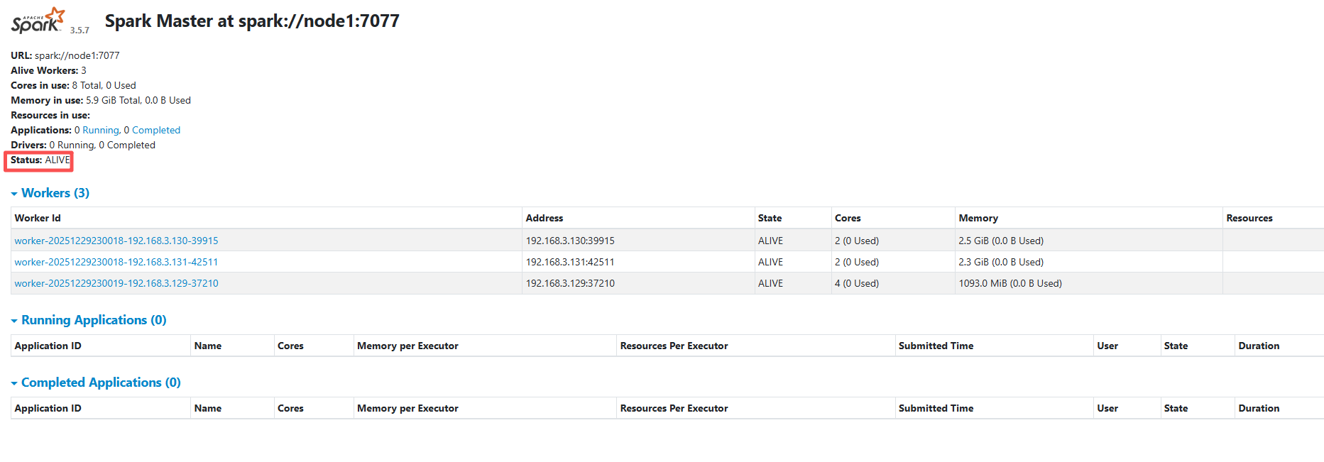 这里Spark 的 Web-UI 页面,端口为 8081。此时可以看到node1 上的 Master 节点处于 ALIVE 状态,并有 3 个可用的 Worker 节点。