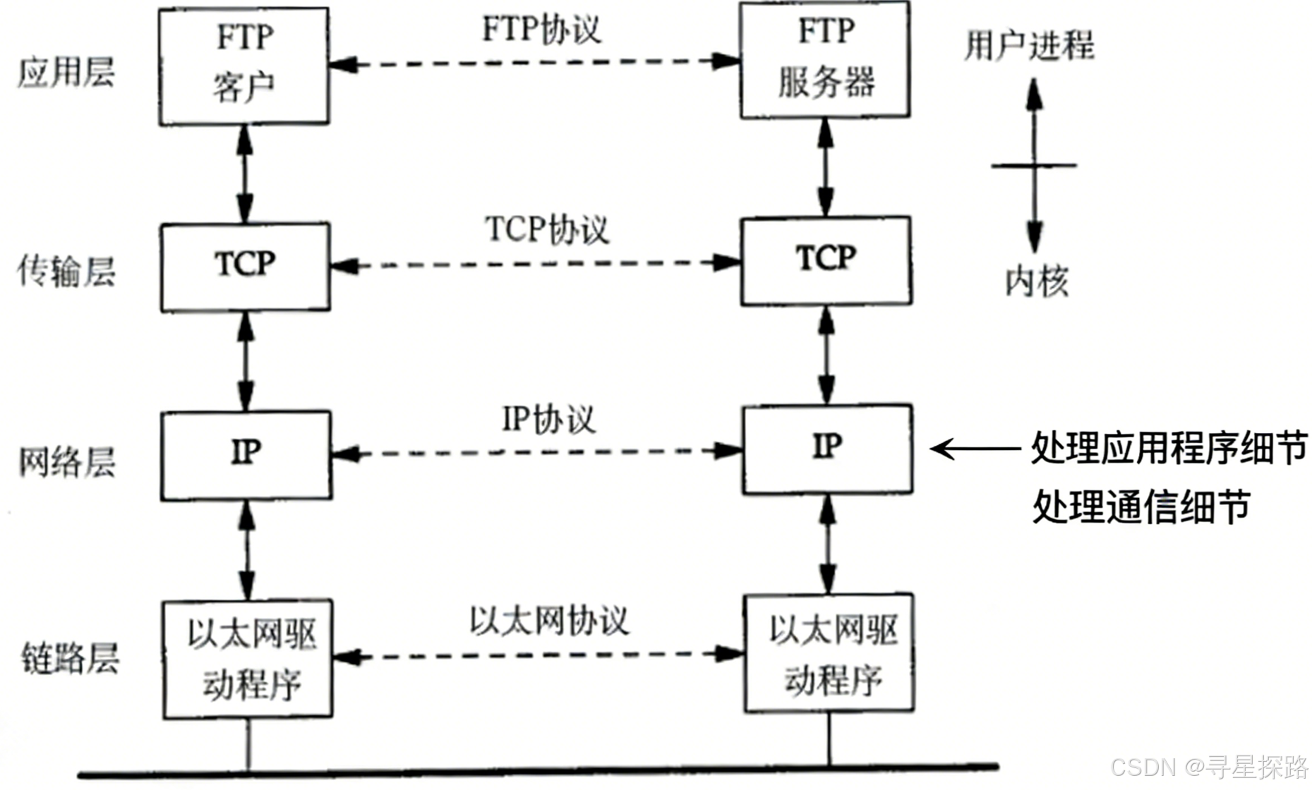 - 下四层(物理、链路、网络、传输)主要由操作系统内核和底层硬件(驱动、路由器、交换机)实现。