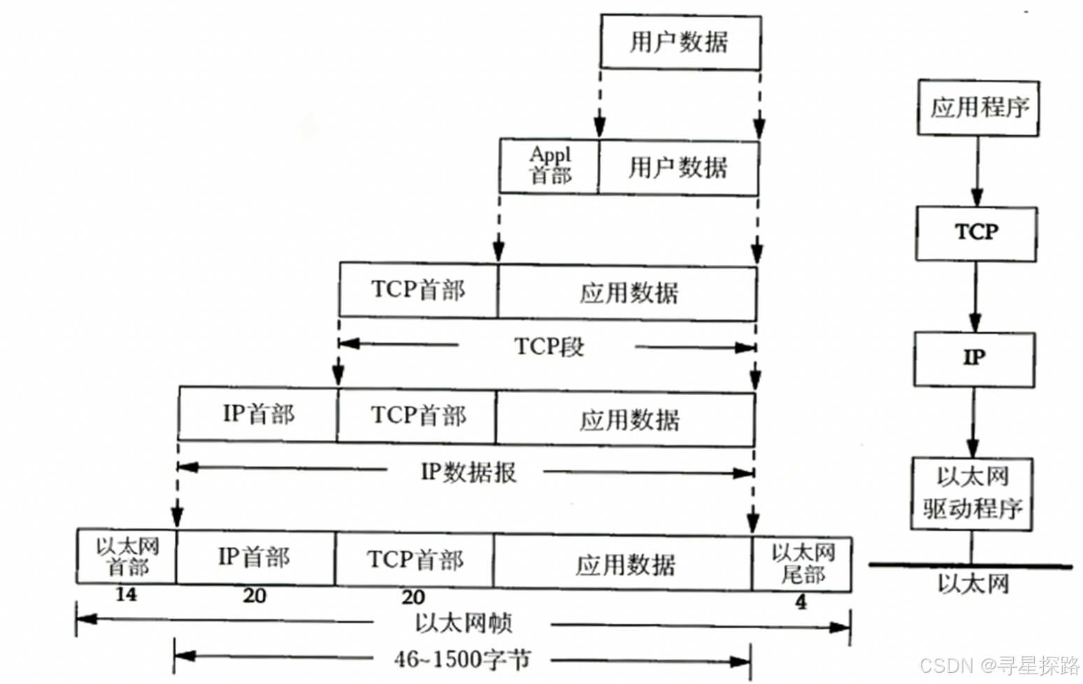 数据从应用层向下流动,每经过一层都会被打上该层的"首部 (Header)"标签: