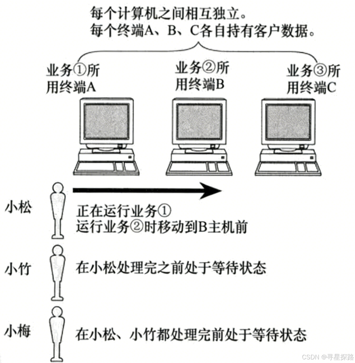 在计算机诞生的早期,每一台机器都是独立的。文档中描述了一个生动的场景:假设有终端 A、B、C,它们各自持有客户数据。小松正在 A 主机上运行业务①。当他需要处理业务②时,由于 B 主机才持有业务②的数据,小松必须起身并物理移动到 B 主机前。