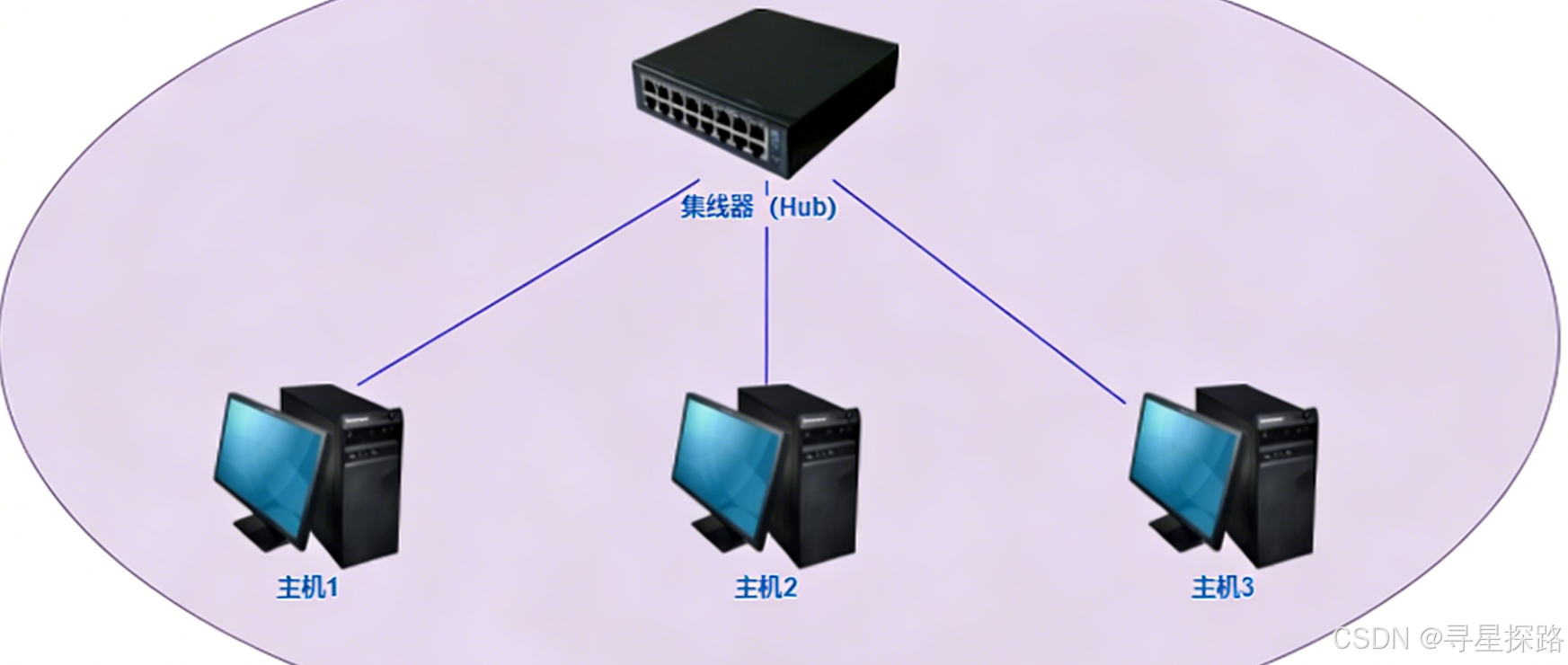 2. **基于集线器 (Hub) 组建**:集线器工作在物理层。它像一个大喇叭,收到信号后会广播给所有人。*(缺陷:所有主机共享带宽,易产生碰撞域)*。