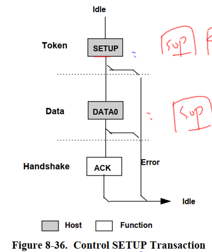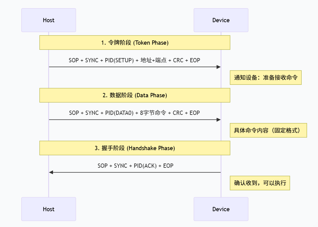 SETUP事务是控制传输的起始信号,用于发送"命令"给设备。它由三个阶段组成:
