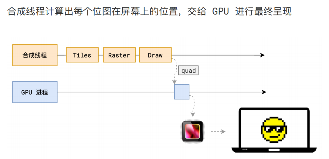 合成线程会把 quad 提交给 GPU 进程,由 GPU 进程产生系统调用,提交给 GPU 硬件,完成最终的屏幕成像。
