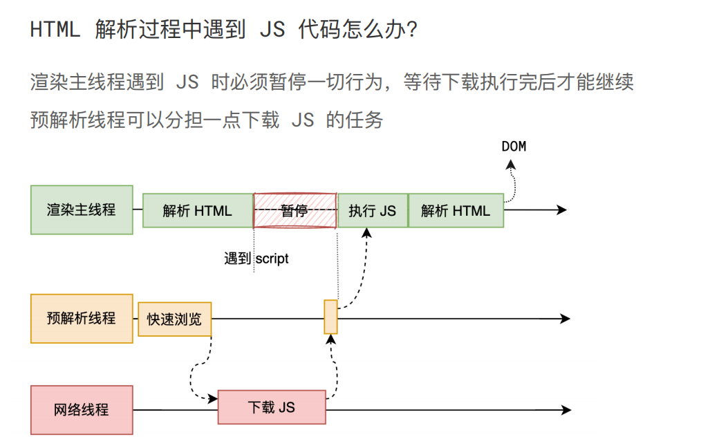 如果主线程解析到script位置,会停止解析 HTML,转而等待 JS 文件下载好,并将全局代码解析执行完成后,才能继续解析 HTML。这是因为 JS 代码的执行过程可能会修改当前的 DOM 树,所以 DOM 树的生成必须暂停。这就是 JS 会阻塞 HTML 解析的根本原因。