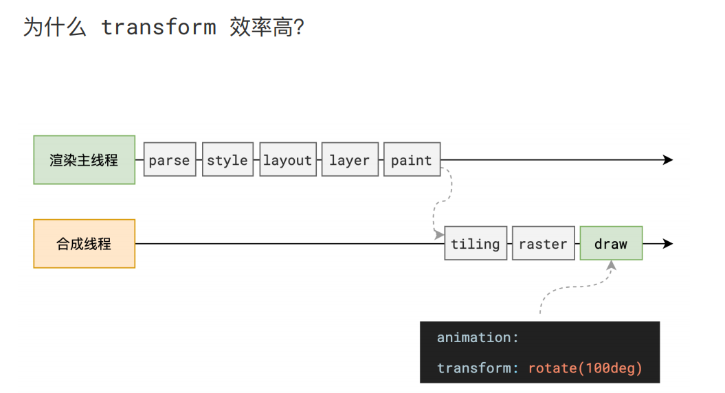 因为 transform 既不会影响布局也不会影响绘制指令,它影响的只是渲染流程的最后一个「draw」阶段。由于 draw 阶段在合成线程中,所以 transform 的变化几乎不会影响渲染主线程。反之,渲染主线程无论如何忙碌,也不会影响 transform 的变化。