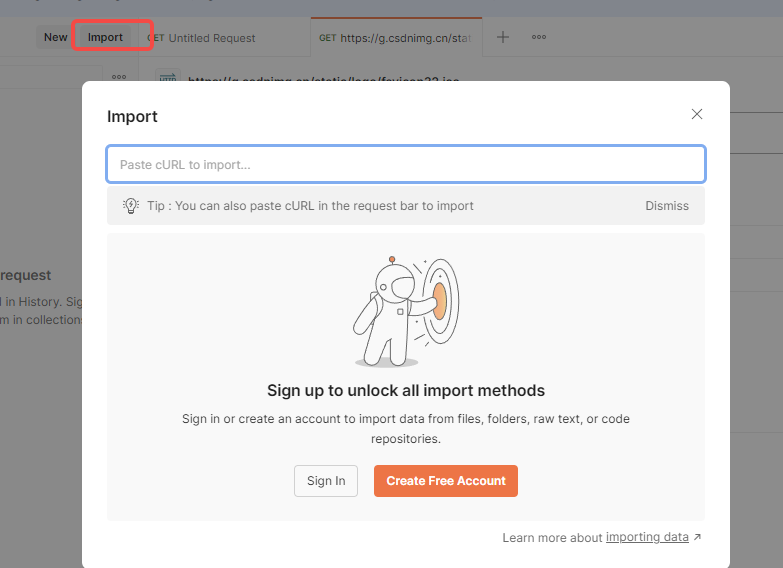 - 打开 Postman→点击 "Import"→选择 "Raw text"→粘贴 cURL 命令→导入成功;