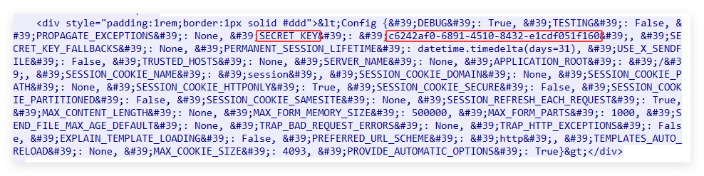 (1)攻击者通常会利用模板注入漏洞,发送类似{{config}}、{{config.items()}}或{{self.__dict__}} 这样的Payload。服务器如果存在漏洞,会把当前的配置信息(包含SECRET_KEY)直接打印在HTTP响应包中。
