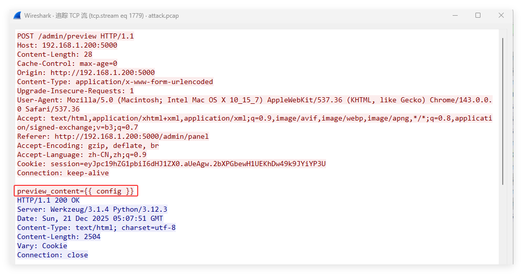 在POST请求体中,攻击者提交了参数:preview_content={{ config }}。这是一个典型的 Flask/Jinja2 模板注入Payload,意图是让服务器渲染并打印出全局config对象。