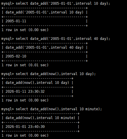 | date_add(date, interval d_value_type) | 在 date 中添加日期或时间interval 后的数值单位可以是:year minute second day |