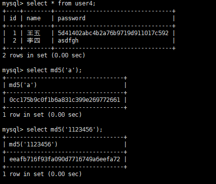 select md5('admin') 对一个字符串进行md5摘要,摘要后得到一个32位字符串