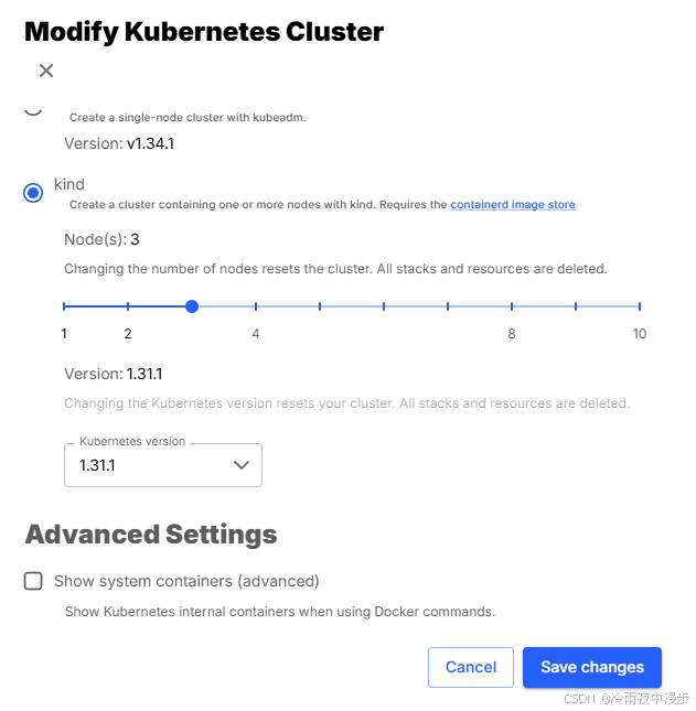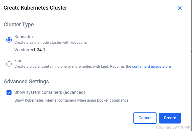 Kubernetes->Enable Kubernetes,这里有两种模式,kubeadm默认为单节点集群,kind可以选择集群节点个数。一般基于一致性协议,3节点是较好的选择