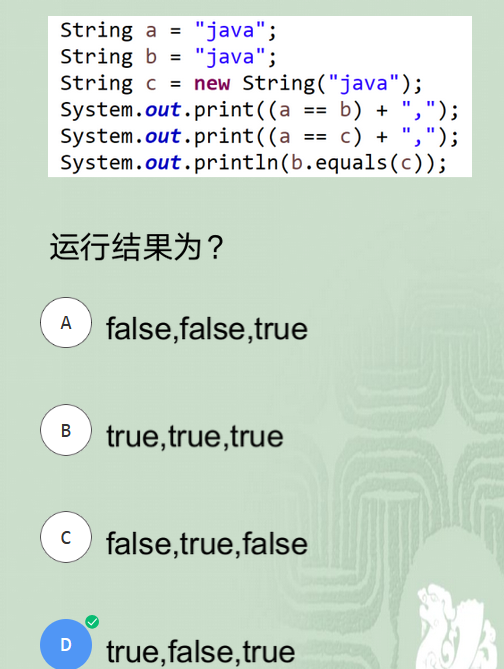 equals()后):javaclass Person { private String name; private int age; // 重写equals(),比较姓名和年龄是否相同 @Override public boolean equals(Object obj) { if (this == obj) return true; // 地址相同直接返回true if (obj == null || getClass() != obj.getClass()) return false; // 非空+同类型判断 Person person = (Person) obj; return age == person.age && Objects.equals(name, person.name); // 比较核心属性 } } // 测试 Person p1 = new Person("张三", 20); Person p3 = new Person("张三", 20); System.out.println(p1.equals(p3)); // true(内容相同)