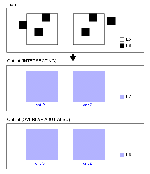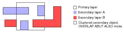 INTERSECTING(仅适用于多边形层),非多边形层需显式指定OVERLAP或OVERLAP ABUT ALSO。