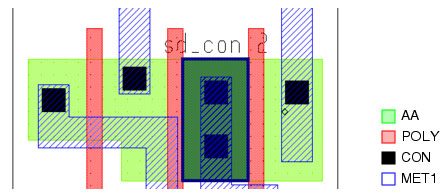 sd图层(源漏区图层)与gate图层(栅极图层)存在邻接关系,因此可以定义第二个DFM Property运算:将gate作为主图层,将sd_count(包含源漏区接触孔计数属性的图层)作为次要图层,并使用OVERLAP ABUT ALSO关键字。gate = POLY AND AA