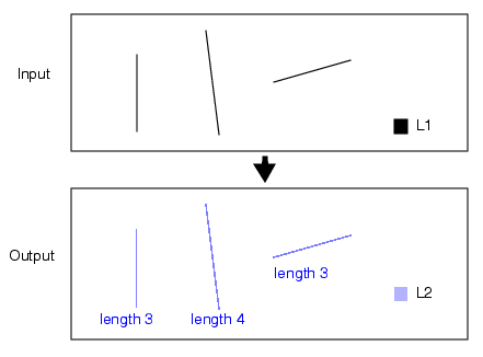 以派生边缘图层 L1 为输入,输出一个新图层,该图层附加了用于报告每条边缘长度的属性。本示例中,被方括号包裹的属性表达式(也称为 DFM 表达式)使用了 LENGTH 测量函数。