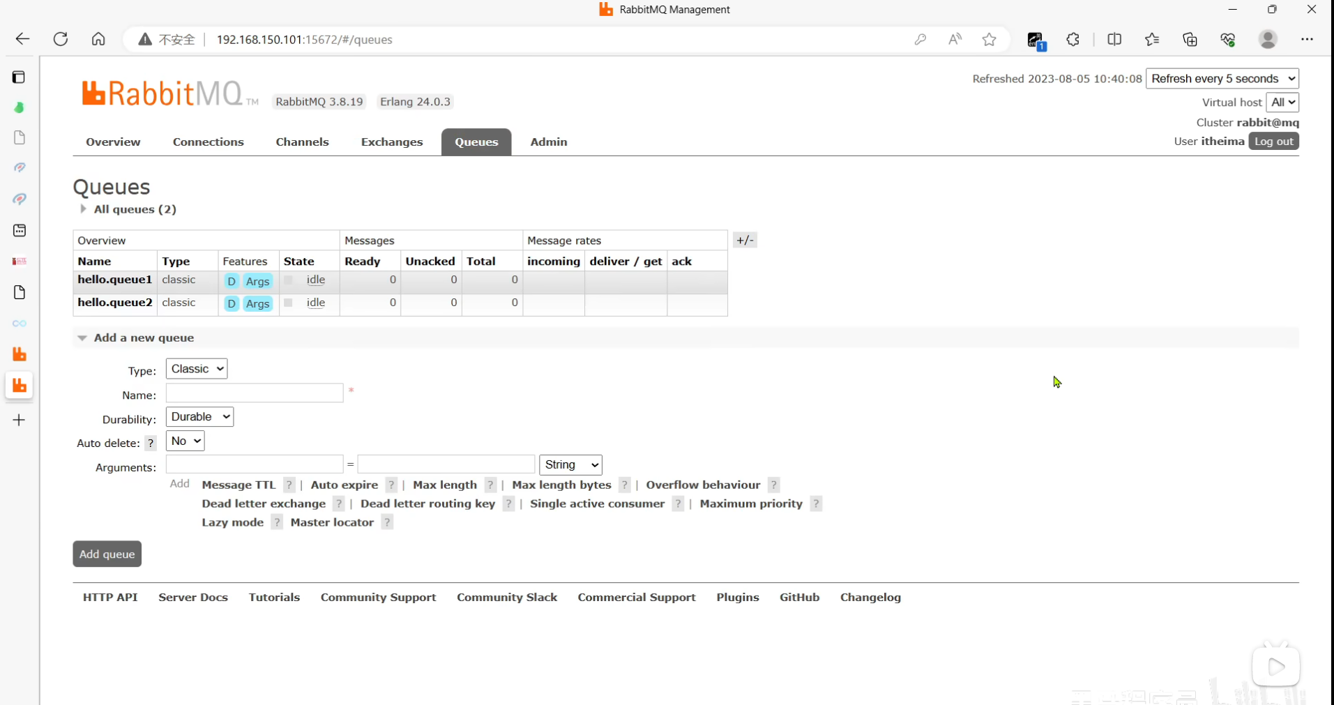 访问方式 :启动RabbitMQ服务后,默认通过浏览器访问 http://[RabbitMQ服务器IP]:15672(默认端口 15672),需输入 RabbitMQ 的用户名 / 密码(默认管理员账号:guest/guest,仅本地访问有效)。