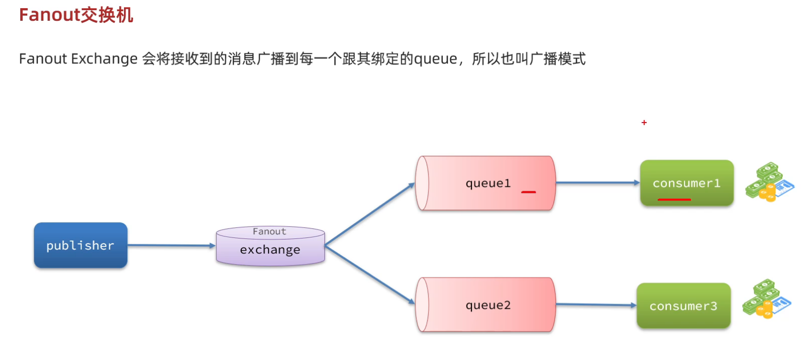 消费者(指定交换机 )->Fanout交换机->广播到所有(与Fanout绑定的)队列