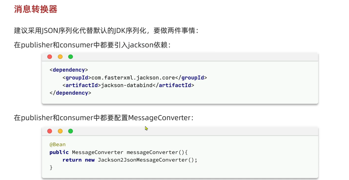 生产者与消费者之间的交换机、队列里面装的消息是序列化后的信息,生产者要通过消息转换器把原始数据转换成交换机、队列之间的消息,消费者要通过消息转换器将接收到的消息转换成原始数据。