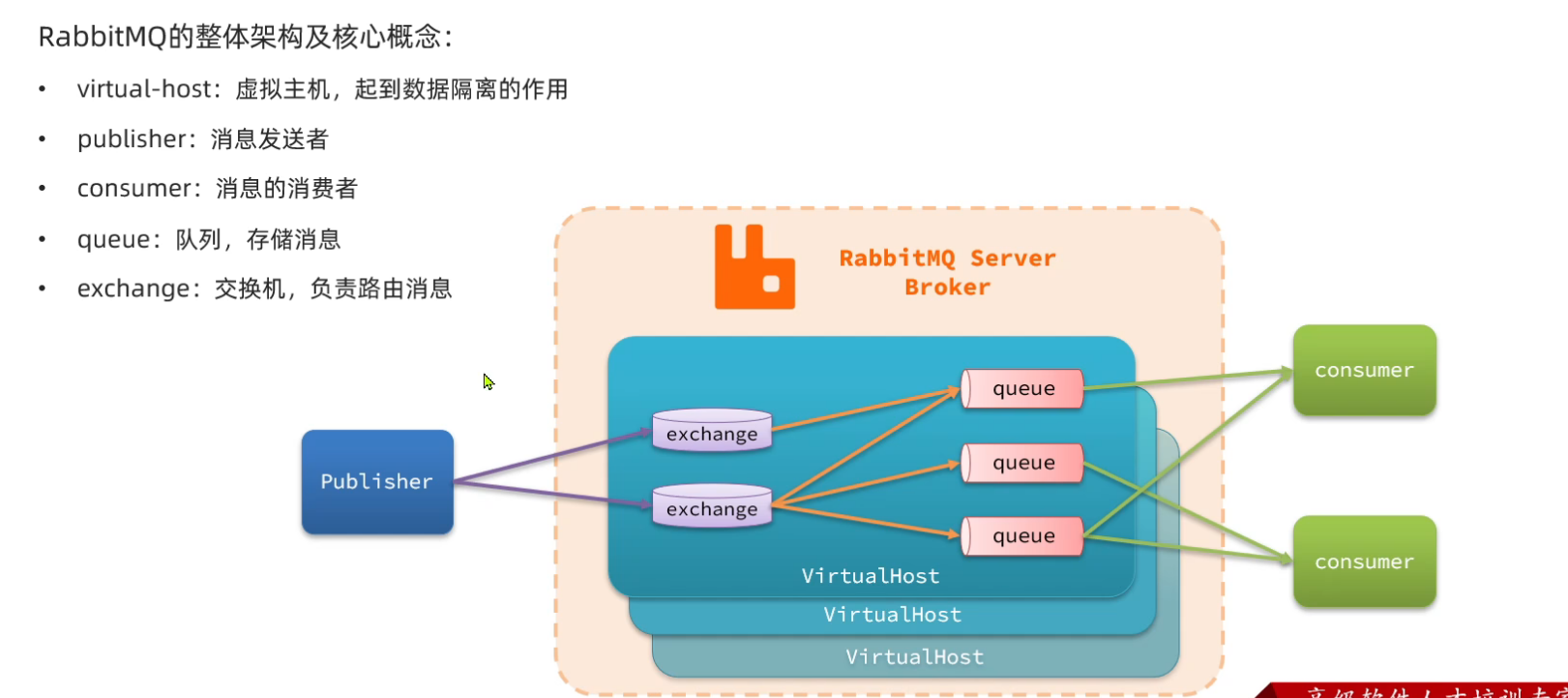 虚拟主机(vhost):一个"用户"只能操作属于自己的虚拟主机里的交换机和队列,起到了数据隔离的作用。