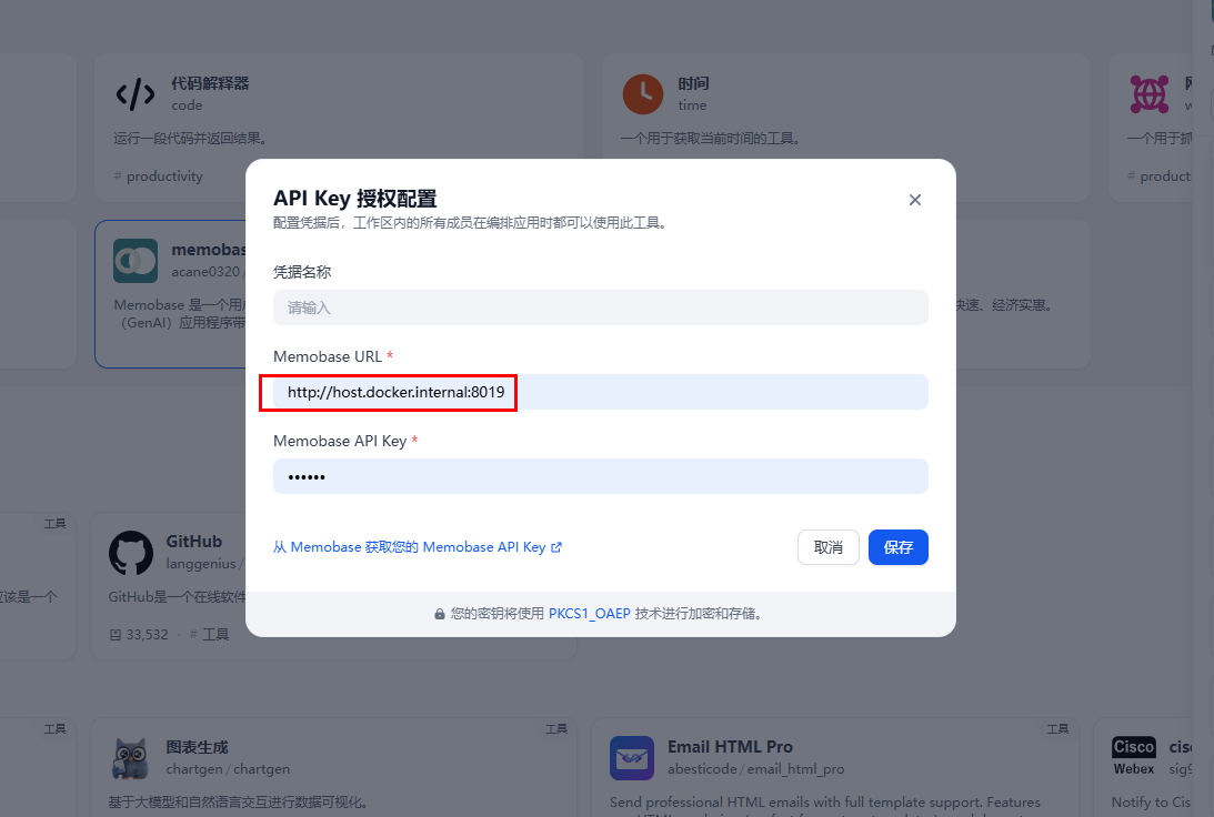 在dify工具库中搜索memobase并安装,配置memobase参数,注意Memobase URL需要使用:http://host.docker.internal:8019 这个位置需要注意下!